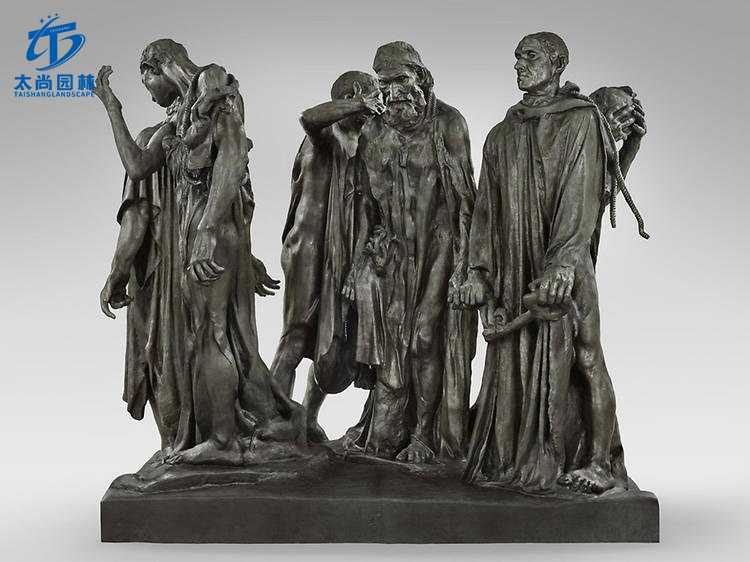 雖然大多數人把法國偉大的雕塑家奧古斯特·羅丹與思想家聯系在一起,但這個紀念英法百年戰爭(1337-1453)中一個事件的合奏在雕塑史上更為重要。受委托在加萊市的一個公園(1346年,英國人在那里解除了長達一年的圍攻,當時有六位鎮上的長老為了保護人口而獻身行刑),市民們避開了當時紀念碑的典型樣式,羅丹沒有把人物孤立起來,也沒有把他們堆在高高的基座上的金字塔里把他真人大小的物件直接放在地上,與觀眾平起平坐。這種走向現實主義的激進舉動打破了通常給予這種戶外作品的英雄待遇。羅丹和市民們一起向現代雕塑邁出了第一步。